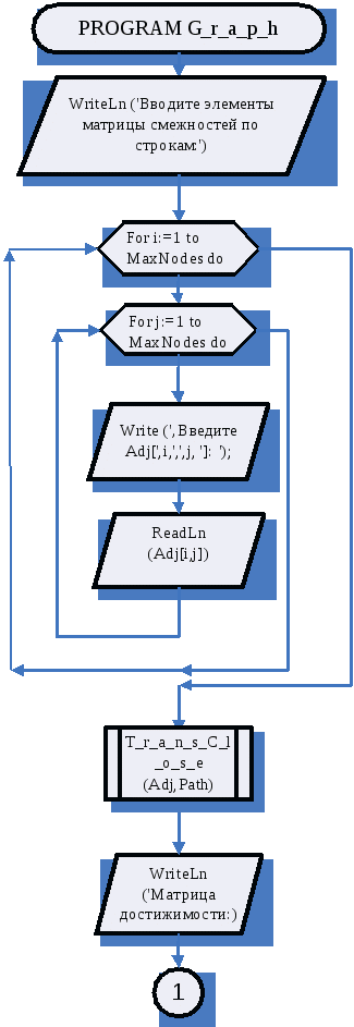 Составить программу определения матрицы достижимости. Теоретически объяснить принцип вычисления матрицы достижимости. Представить текст программы с комментариями, а также показать ее схематически (в виде блок – схем). Проверить правильность работы программы, тем самым показать результаты тестирования. В итоге сделать выводы по проделанной работе.