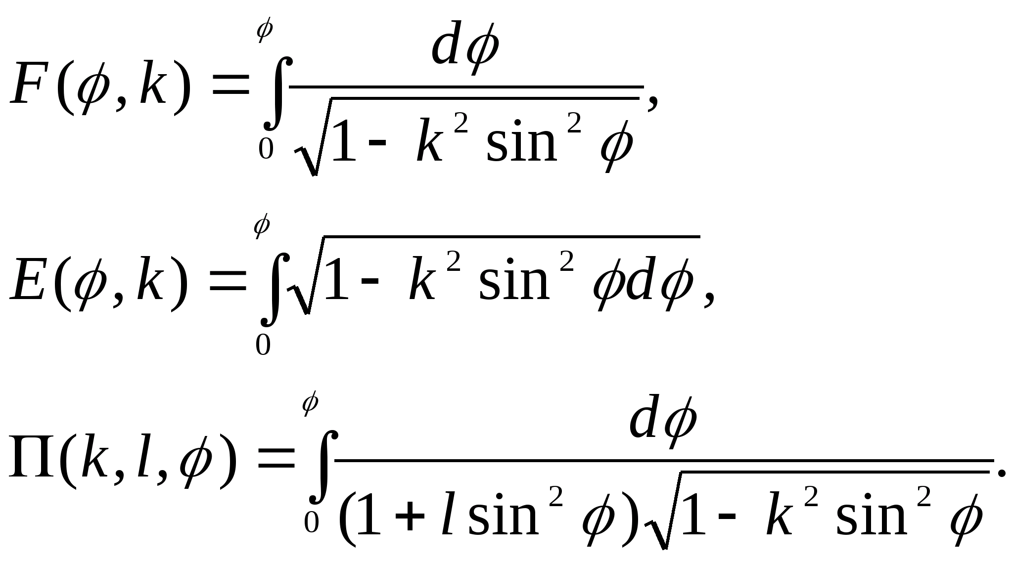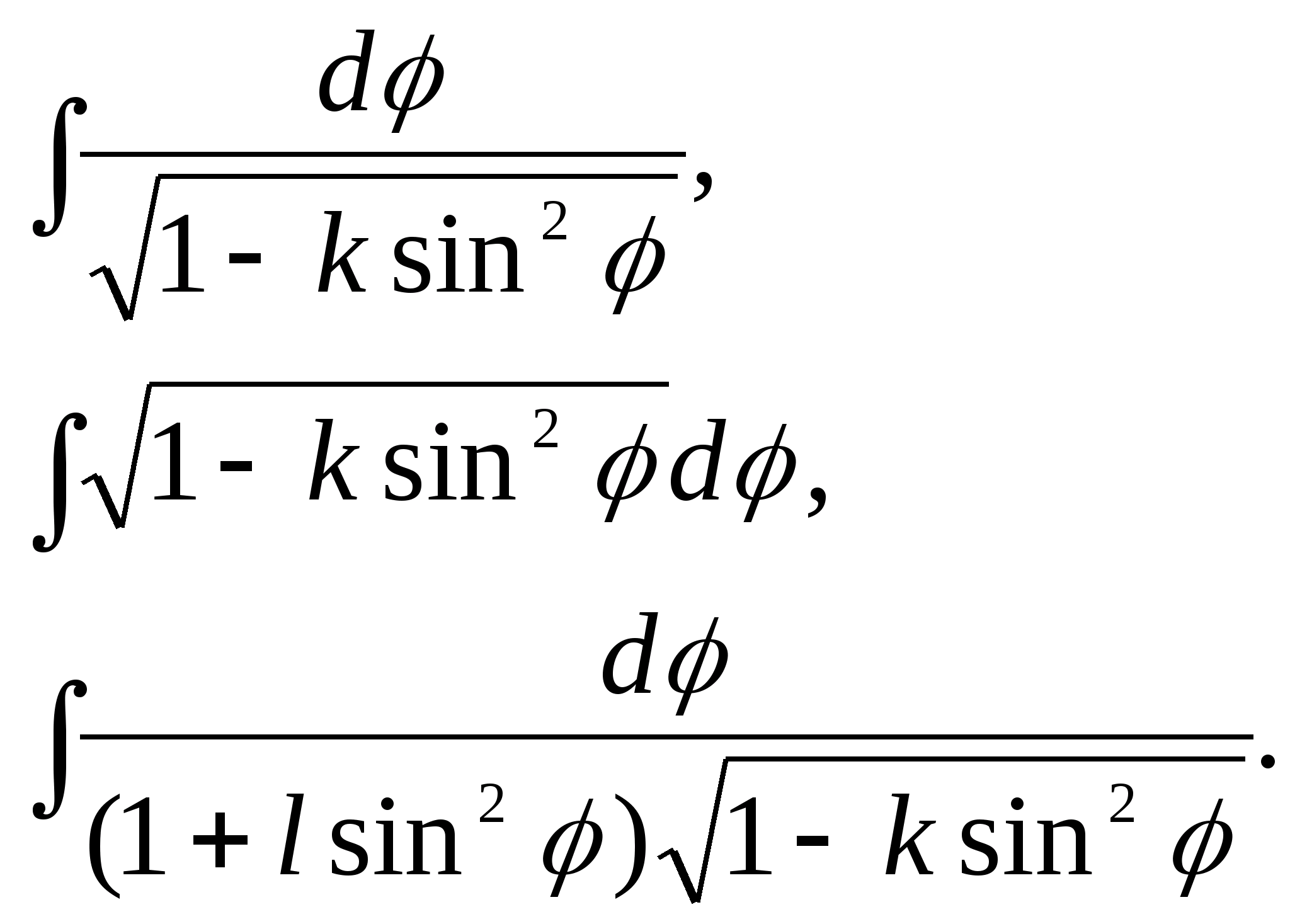 Вообще же интеграл (13) не выражается в элементарных функциях. Можно показать, что с помощью элементарных подстановок и преобразований эллиптический интеграл преобразуется к одной из трех канонических форм