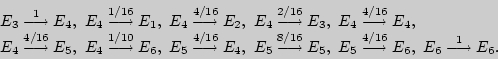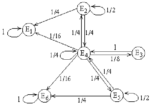 Для расчета вектора P(1) применим формулу (5), т.е. P(0) умножим на матрицу вероятностей перехода. Получим P(1) = <0,5; 0,3333; 0,0833; 0,0833>.