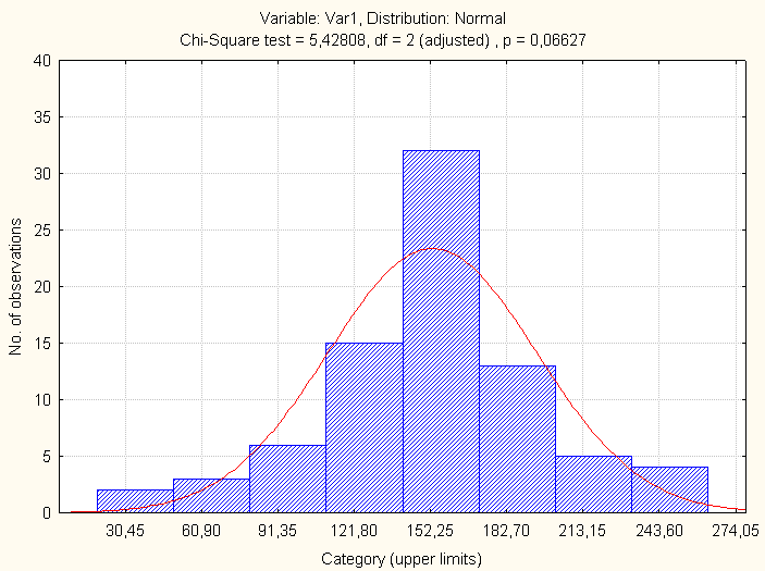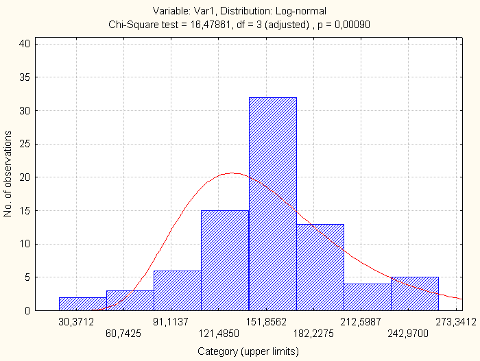 На рис. 6.3 приведена гистограмма и расчетная кривая логнормального распределения переменной Var1.