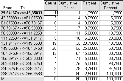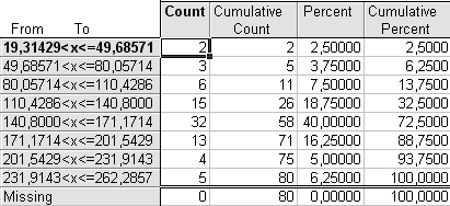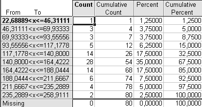 Cumulative Count – накопленные абсолютные частоты, получаемые последовательным суммированием частот по группам. Сумма накопленных частот по каждой строке означает, какое количество единиц совокупности (регионов) имеет значение признака, не превышающее значения верхней границы данного интервала. Общая сумма накопленных частот соответствует объему изучаемой совокупности (80).