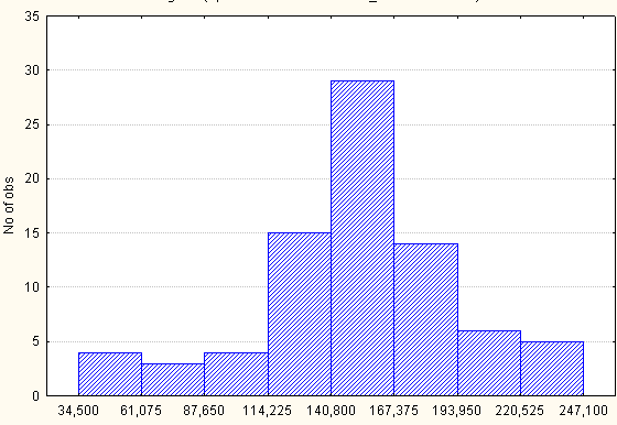 Рис. 1.5. Гистограмма распределения количества легковых автомобилей на 1000 чел. населения по регионам России за 2005 г. (n=8)