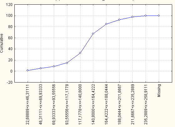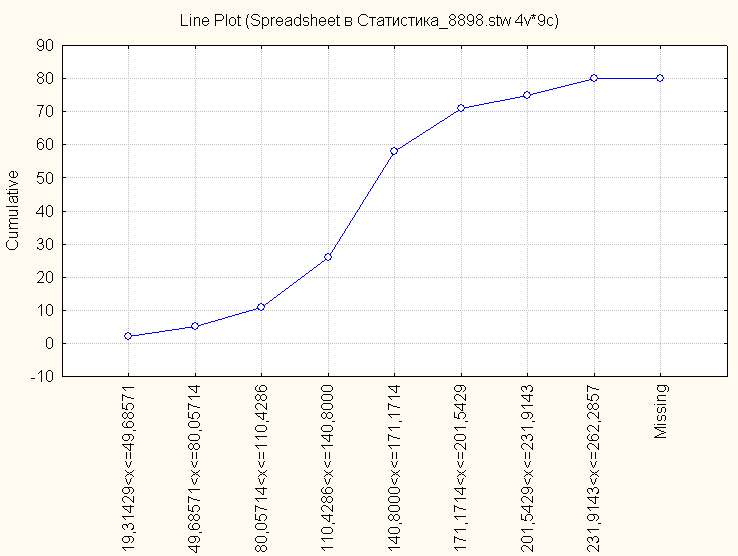 На рис. 1.3 приведена кумулята распределения в абсолютных частотах, а на рис. 1.4. – в относительных частотах.