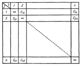 Сумма в выражении (1) распространена по всем индексам i и j, удовлетворяющим условию (α), т.е. условию, что каждый из индексов i и j входит в выражение (1) один и только один раз. Функция l = l(x>1>, …, x>N>) является, таким образом, аддитивной – она представима в виде суммы слагаемых, однако сама задача – задача отыскания минимума l – в силу ограничения (α) не является аддитивной и не удовлетворяет принципу оптимальности.