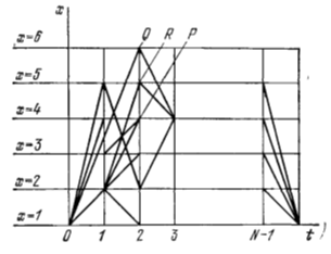 Рассмотрим снова плоскость t, x, где t – дискретный аргумент, принимающий значения 0,1, 2, …, N, соответствующие этапам путешествия торговца. Значит t = 0 соответствует его начальному положению в городе номер 1, t = 1 – переходу из города номер 1 в город, который он выбрал первым для посещения, и т.д., t = N означает последний этап его путешествия – возвращение в город номер 1. Аргумент x теперь также принимает дискретные значения 1,2, …, N (Рисунок 1.1). Соединим точку (0, 1) с точками (1,1), (1, 2), …(1, N) и длинам отрезков, соединяющих эти точки, припишем значения f(x>1>,x>j>). Далее точки (1, s) – узлы, лежащие на первой вертикали, мы соединим со всеми уздами второй вертикали, длинам отрезков мы припишем значения f(x>s>, x>k>) и т.д. точки (N-1, s) соединим с точкой (N,1).