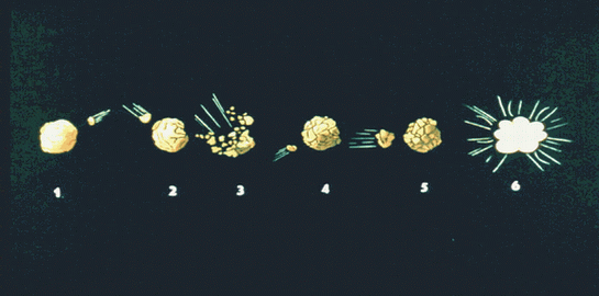 Схема образования мелких небесных тел в результате столкновения двух астероидов различной величины, которые могут стать метеоритами, упав на Землю.