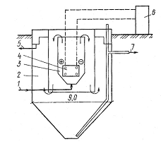 1 - подача сточных вод; 3 - отстойник; 3 - резервуар; 1-электрокоагулятор; 4 - пакет плоских листовых стальных электродов; 5 - выпуск обработанных сточных вод в систему оборотного водоснабжения; 6 - выпрямитель электрического тока; 7 - выпуск осадка.