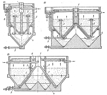 На рис. 4 приведены конструкции осветлителей, разработанных ВНИИ ВОДГЕО с поддонными (а, б) и вертикальными (в) осадкоуплотнителями.