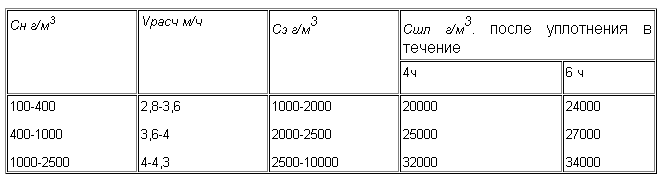 Исходя из концентрации взвешенных веществ в обрабатываемой сточной воде Си, при известных расчетной скорости восходящего потока воды в зоне осветления Vрасч, эталонной концентрации взвешенных веществ во взвешенном слое Сэ (при скорости движения воды 1 мм/с и температуре 20 °С) и концентрации взвешенных веществ в осадке, после его уплотнения Сщл (табл. 1), можно определить расход воды и размеры осветлителя.