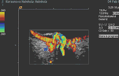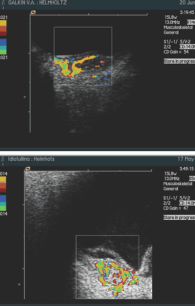 Изменение кровотока в новообразованных сосудах гемангиомы с учетом локализации патологического очага сопровождается увеличением максимальной систолической скорости кровотока во внутриопухолевых сосудах, что более демонстративно при юкстапапиллярной локализации гемангиомы. В среднем она оказалась выше, чем при макулярной и парамакулярной локализациях, и составила 24,6 см/с и 18,7 см/с соответственно. Т.о., при юкстапапиллярной локализации гемангиомы отмечается усиление скорости кровотока в среднем в 1,3 раза. Обнаруженные изменения можно рассматривать, как документальное подтверждение двойного кровоснабжения опухоли.