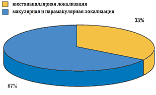 Располагаясь в центральной зоне, гемангиома почти в 2/3 случаях поражает макулярную и парамакулярную области. Юкстапапиллярное расположение гемангиомы, по нашим данным, встречается у 1/3 больных (рис. 2).