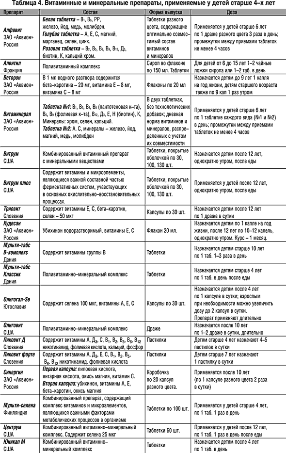 У детей старше года профилактика дефицита витаминов и микроэлементов проводится с помощью назначения полноценной, сбалансированной диеты, а также индивидуального приема специальных поливитаминных препаратов (табл. 3, 4).