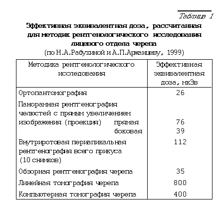 Как видно из приведенной таблицы, особенно велики дозовые нагрузки при исследовании всего зубного ряда, выполненного на аппарате типа 5Д-1 и 5Д-2м без дополнительной защиты. Резко снижает лучевую нагрузку на пациента исследование с помощью ортопантомографа. Дополнительное экранирование, в том числе щитовидной железы, делает исследование еще более безопасным.