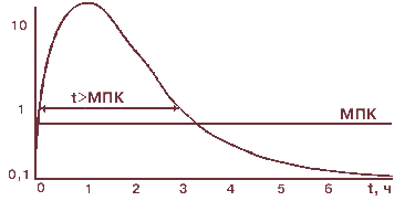Фармакодинамика карбапенемов сходна с фармакодинамикой других b-лактамных антибиотиков. Согласно современным представлениям, их бактерицидное действие зависит не от максимальной концентрации (как, например, для аминогликозидов), а от времени поддержания уровня в крови выше минимальной подавляющей концентрации (МПК) для данного возбудителя. Поэтому не следует стремиться к тому, чтобы концентрация превышала МПК в 10–15 раз; достаточно ее поддержания на уровне 2-4-кратных значений ( рис.1). Повышение концентрации b-лактамов выше этого уровня не приводит к увеличению гибели микроорганизмов. В связи с этим более важное значение имеет не величина разовой дозы, а кратность введения карбапенемов.