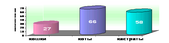 Распределение уролитиаза по половому признаку в группе кошек, по материалам исследований, представлено на диаграмме 3