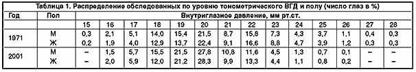 Для ответа на вопрос, насколько стабилен уровень индивидуального ВГД в течение жизни, мы провели исследование офтальмотонуса у 491 человека, которым проводилось его трехкратное измерение в течение 5–7 лет. Колебания ВГД в пределах от 0 до 3 мм рт. ст. было отмечено у 89% исследованных, от 4 до 6 – у 11%. Разбросов офтальмотонуса, составляющих больше 6 мм рт. ст., отмечено не было. Это позволяет нам утверждать, что индивидуальное ВГД – величина достаточно постоянная и поэтому срез данных индивидуального ВГД у наших обследованных является репрезентативным. Далее мы проанализировали данные исследований 2001 г.