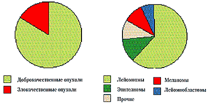 Однако изучение клинической картины иридоцилиарных опухолей, их морфогенеза позволило высказать суждение о преобладании (60–90%) доброкачественных опухолей (Левкоева Э.Ф., 1973; Зиангирова Г.Г., 1978; Shields J.A., 1983; Саакян С.В., 1987). Рис. 1 иллюстрирует частоту злокачественных и доброкачественных новообразований иридоцилиарной зоны (476 наблюдаемых нами больных). Длительное наблюдение (до 15 лет) показало, что злокачественные опухоли радужки и цилиарного тела имеют более благоприятный прогноз, чем при локализации в хориоидее, что можно объяснить преимущественно веретеноклеточным строением этих опухолей. Все это позволило отказаться от энуклеации, как безальтернативного метода лечения. К концу 70–х годов было предложено большое количество методик органосохраняющих операций (Волков В.В., 1971; Barraquer J., 1975; Mathieu M., 1975; Линник Л.Ф., 1977; Бровкина А.Ф. и др. 1978, 1979). Однако увеличение количества проводимых в клиниках операций подобного рода привело к увеличению числа пациентов, которые, избавившись от основного заболевания, страдают в дальнейшем от функциональных расстройств, развивающихся после блокэксцизий.