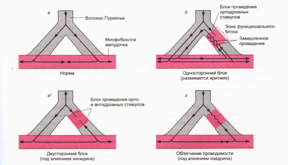 Нарушения проводимости проявляются в разных степенях блока проведения по проводящей системе сердца. О проводимости судят по скорости нарастания амплитуды потенциала действия (фаза 0). При снижении проводимости скорость систолической деполяризации – фазы 0 (V>max>) – уменьшается (максимальное значение потенциала действия достигается более медленно). На ЭКГ нарушение проводимости в предсердно-желудочковом (атриовентрикулярном) узле проявляется увеличением интервала Р–R, а внутрижелудочковой – длительности QRST. Функциональный блок проведения может быть односторонним (рис. 1.3). В этом случае аритмии развиваются по механизму «повторного входа» (или «возврата возбуждения»). Таким путем могут возникать аритмии и в предсердиях, и в желудочках.