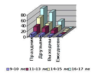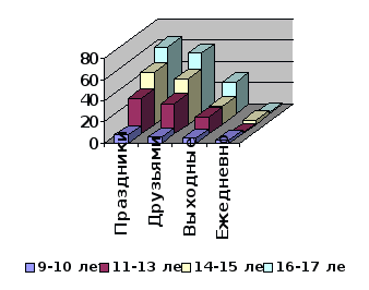 А.И. Исхакова (1929) приводит данные о частоте употребления спиртных напитков родителями и детьми в различных ситуациях: