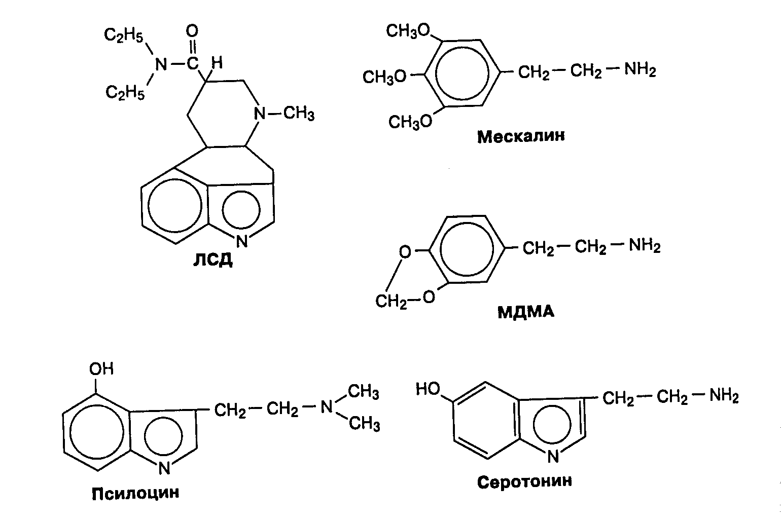 Рис. 2. Химическая структура широко используемых галлюциногенов и их аналога серотонина