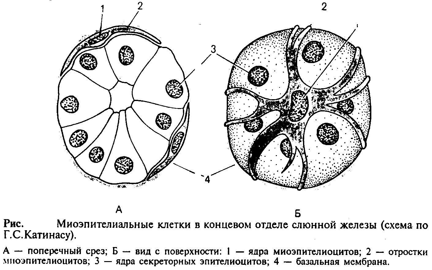 Они встречаются в потовых, молочных, слюнных и слезных железах и имеют общих предшественников с их секреторными клетками. Миоэпителиальные клетки непосредственно прилежат к собственно эпителиальным и имеют общую с ними базальную мембрану. При регенерации те и другие клетки тоже восстанавливаются из общих малодифференцированных предшественников. Большинство миоэпителиальных клеток имеют звездчатую форму. Эти клетки нередко называют корзинчатыми: их отростки охватывают концевые отделы и мелкие протоки желез (рис.4). В теле клетки располагаются ядро и органеллы общего значения, а в отростках – сократительный аппарат, организованный, как и в клетках мышечной ткани мезенхимного типа.