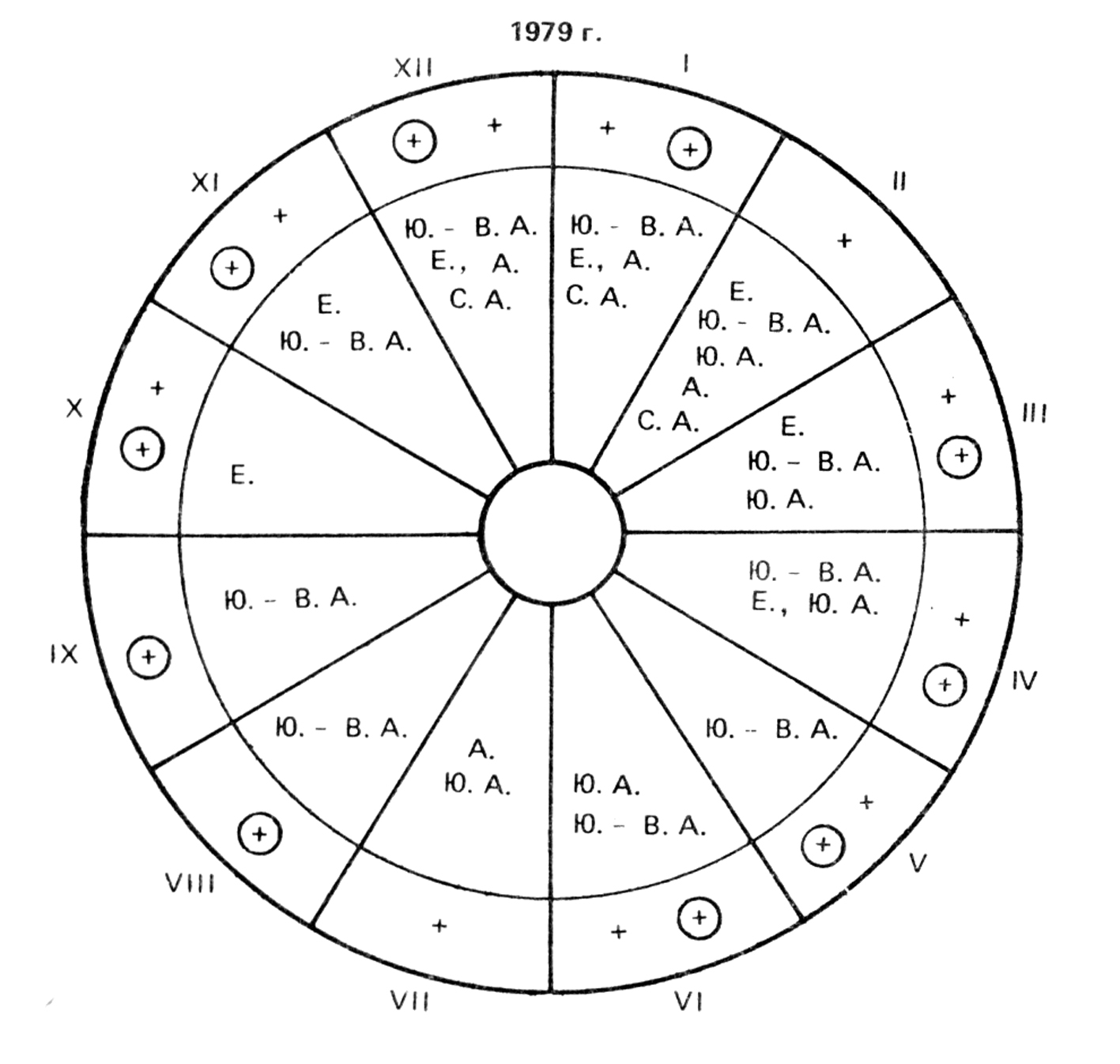 рис.2 (продолжение). Распространение гриппа в различных странах мира в течении года. +- А(H2N1); +- A(H3N2); Е. - Европа; А. - Африка; Ю.-В.А. - Юго-Восточная Азия; С.А. - Северная Америка; Ц.А. - Центральная Америка; Ю.А. - Южная Америка.