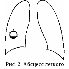 Рентгенологически после прорыва гнойника в бронх определяется овальной формы полость (рис. 2) с уровнем жидкости и газовым пузырем над ней. При гангрене вначале выявляется гомогенная инфильтрация легкого, в котором затем появляются отдельные очаги просветления без ровных контуров.