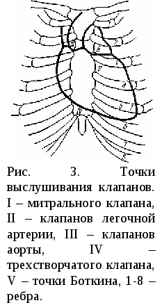 Места выслушивания тонов и шумов. Тоны сердца выслушиваются в местах, где они лучше всего проводятся (рис. 3). Вначале выслушивают митральный клапан, затем аортальные клапаны, клапаны легочной артерии, аорту и трехстворчатые. Тоны и шумы, возникающие в митральном клапане, выслушиваются на верхушке сердца, тоны и шумы, возникающие в области клапанов устья аорты, лучше всего выслушиваются у края грудины справа во втором межреберье. Для выслушивания диастолического шума, возникающего при недостаточности аортальных клапанов, существует еще и пятая точка (точка Боткина), она расположена, в третьем межреберье слева у края грудины. Тоны и шумы, возникающие на месте прикрепления легочной артерии, выслушиваются во втором межреберье слева у края грудины. Тоны и шумы, возникающие на месте трехстворчатого клапана, закрывающего правое венозное отверстие, выслушиваются на нижнем конце тела грудины справа.