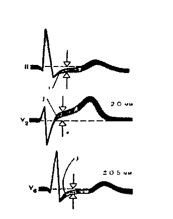 Точка перехода комплекса QRS в сегмент RS - Т обозначается как точка RS - Т - соединения (j). Отклонения точки j от изолинии часто используют для количественной характеристики смещения сегмента RS - Т.