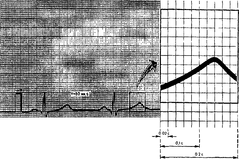 Рисунок 25. Запись ЭКГ на миллиметровой бумаге со скоростью 50 мм с"1. Каждый миллиметр бумаги по горизонтали соответствует 0,02 с, каждые 5 мм - 0,1 , а 10 мм - 0,2 с. Справа - увеличенный в 5 раз отрезок кривой.