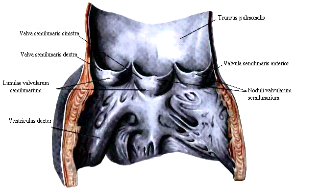 Отверстие легочного ствола, ostium tranci pulmonalis, располагается впереди и слева, оно ведет в легочный ствол, truncus pulmonalis; к его краю прикрепляются образованные дупликатурой эндокарда три полулунных клапана: передний, правый и левый, valvula semilunares sinistra, valvula semilunares anterior, valvula semilunares dextra, свободные их края выступают внутрь легочного ствола.