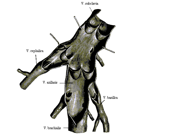 а) Верхняя полая вена, v. cava superior, собирает кровь от головы, шеи, верхних конечностей и стенок туловища и открывается на границе верхней и передней стенки правого предсердия отверстием верхней полой вены, ostium venae cavae superioris.