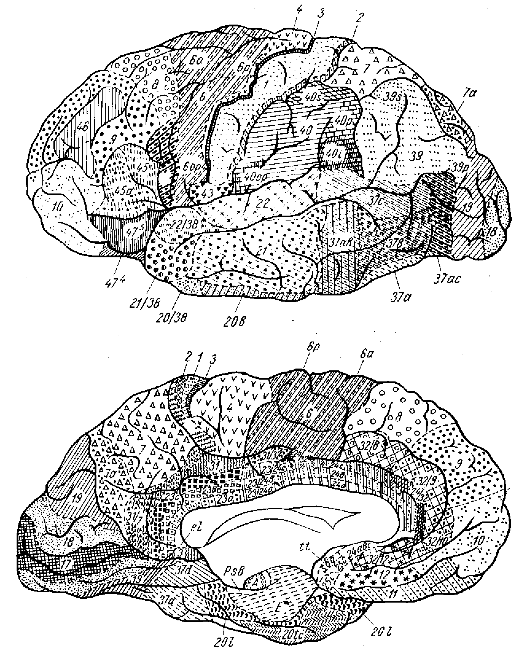 Рисунок 3. Карта цитоархитектонических полей мозга человека (по данным института моэга АМН СССР) Вверху - верхнелатеральная поверхность,внизу- медиальная поверхносгь. Объяснение в тексте.