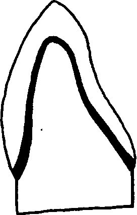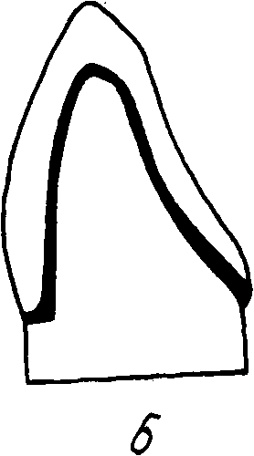 Контактные и боковые поверхности препарируются на конус под углом не более 5—7°. На сагиттальном распиле такой зуб должен напоминать разносторонний треугольник с очень острым углом, поскольку режущий край сходит на нет.
