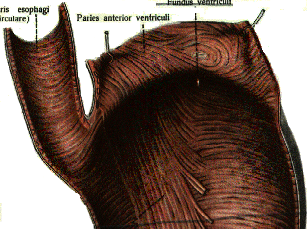 Итак началом этого участка Ж.К.Т. можно считать ту часть где пищевод соединяется с диафрагмой. В этом месте мышечная оболочка пищевода тесно сращена мышечной оболочкой диафрагмы образуя таким образом круговой мускул – “сфинктер”. В то - же время некоторые мышечные пучки диафрагмы присоединяются к стенке пищевода, и с ним идут ко входу в желудок. Круговые мышечные волокна пищевода располагаются в этом отделе иначе чем в верхних отделах и в свою очередь также принимают участие в формировании кругового мышечного жома. Это мышечное кольцо позволяет закрывать hiatus oesophagus и получило название "Сфинктер Губарева". Эти взаимоотношения пищевода и диафрагмы выполняют еще одну немаловажную функцию. Дело в том, что в зависимости от сокращения мускулатуры диафрагмы брюшная часть пищевода может изменяться в размерах. Кроме того и при вздутии желудка эта часть пищевода становится короче; при опущении желудка и в положении лежа брюшная часть пищевода удлиняется. Эта растяжимость объясняется различной подвижностью различных отделов желудка. Наименее подвижно место перехода пищевода в желудок. Эта часть расположена непосредственно под диафрагмой и фиксирована в ее отверстии. Помимо этого кардиальная часть желудка и его дно связаны с диафрагмой посредством lig. phrenicogastricum dextrum et sinistrum правая идущая от диафрагмы к передней поверхности пищевода и кардиальной части желудка, и левая идущая от диафрагмы к дну желудка. Правая входит в состав малого сальника, а левая входит в lig. gastrolienale которая и свою очередь переходит в большой сальник. После прохождения диафрагмы пищевод немного расширяется и делает крутой изгиб влево так что край перегиба образует на левой стороне просвета нечто вроде заслонки и препятствующей до определенной степени забрасыванию содержимого желудка в пищевод. Мышечная оболочка желудка как известно является продолжением мышечной оболочки пищевода. Наружные (продольные) волокна пищевода в области cardia, расходятся в различных направлениях, не достигая однако большой кривизны. Большая часть этих волокон переходит на малую кривизну.