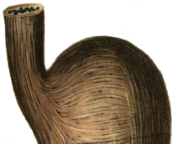 Внутренний слой волокон (циркулярный) имеют болие косое направление по отношению к продольной оси желудка. Часть последних как - бы сидит верхом или в виде седла налегает на угол между пищеводом и дном желудка, и направляется направо и вниз. Другая часть располагается точно таким – же образом справа от cardia на малой кривизне и в свою очередь направляется веерообразно налево и вниз.