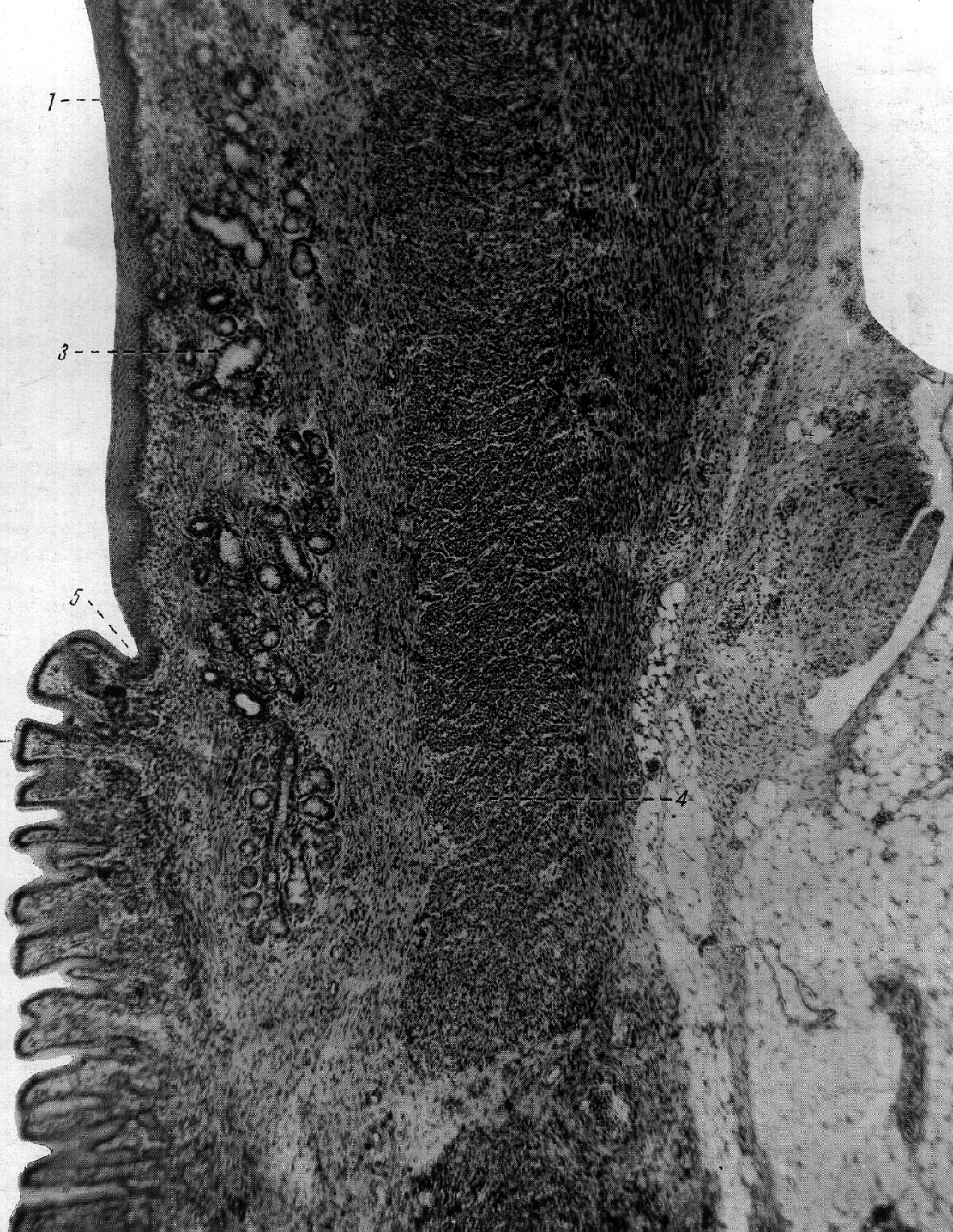 Мышечная пластинка слизистой оболочки в области перехода пищевода в желудок хорошо выражена и идет в два пучка, один из которых продолжается в мышечную пластинку слизистой оболочки желудка, а второй (меньший) теряется в подслизистой основе желудка.