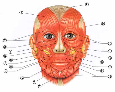 Мышцы головы 1 Лобная 2 Глазничная часть круговой мышцы глаза 3 Крыльная часть носовой мышцы 4 Поперечная часть носовой мышцы 5 Малая скуловая 6 Жевательная 7 Поднимающая угол рта 8 Большая скуловая 9 Щечная 10 Опускающая угол рта 11 Опускающая нижнюю губу 12 Подбородочная 13 Подкожная мышца шеи 14 Мышца смеха 15 Круговая мышца рта 16 Расширяющая ноздри 17 Поднимающая верхнюю губу 18 Подниматель верхней губы носовой мышцы 19 Вековая часть круговой мышцы глаза 20 Височная 21 Сухожильный шлем