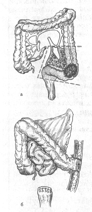 Переднюю резекцию прямой кишки выполняют из нижней срединной лапаротомии, После мобилизации прямой кишки её пересекают на 4 - 5 см ниже опухоли. Пересекают сигмовидную ободочную кишку (удаляя тем самым подлежащий резекции участок кишки) и накладывают анастомоз между сигмовидной ободочной кишкой и культей прямой кишки. В пресакральное пространство вводят дренаж, а в кишку через задний проход - зонд, проводя его выше линии анастомоза - для декомпрессии кишки. При брюшно-анальной резекции прямой кишки с низведением сигмовидной, нисходящей или поперечной ободочной кишки производят нижнюю срединную лапаротомию. Мобилизуют прямую, сигмовидную и нисходящую ободочную кишки. Рану брюшной стенки зашивают. После растяжения заднего прохода стенку кишки рассекают по прямокишечно-заднепроходной линии и отсепаровывают слизистую оболочку до верхнего края анального канала, перфорируют мышейную оболочку прямой кишки над анальным каналом и отсекают прямую кишку. Низводят прямую и сигмовидную ободочную кишку через задний проход и отсекают сигмовидную ободочную кишку на уровне, определенном при брюшном этапе операции. Края низведенной кишки фиксируют по окружности анального канала.