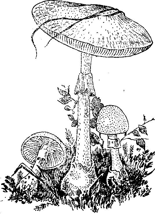 Бледная поганка относится к самым ядовитым грибам, отравление сопровождается высокой летальность (до 50%). Токсическое действие этих грибов обусловливается содержанием в них аманитоксина. Яд этого гриба не разрушается нагреванием и пищеварительными ферментами. Бледные поганки несколько похожи на шампиньоны, растут с июля по октябрь. Шляпка поганки выпуклая, позднее плоская, диаметром 8—10 см (рис. 4). Цвет шляпки желтоватый или зеленоватый, иногда с бледно-оливковым оттенком. Пластинки чистые, белые. Ножка гриба имеет белую манжетку и несколько утолщенное основание. Признаки отравления наступают через 10—12 ч. При этом отмечается бурное развитие желудочно-ки-шечных расстройств: появляются многократная рвота, резкая боль в животе, жидкий стул, желтуха, бессознательное состояние, в тяжелых случаях наступает смерть (1—2 дня).