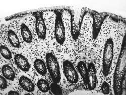 Рисунок 1. Слизистая оболочка толстой кишки при ротавирусном гастроэнтерите. Минимально выраженный катаральный колит. х 100. |