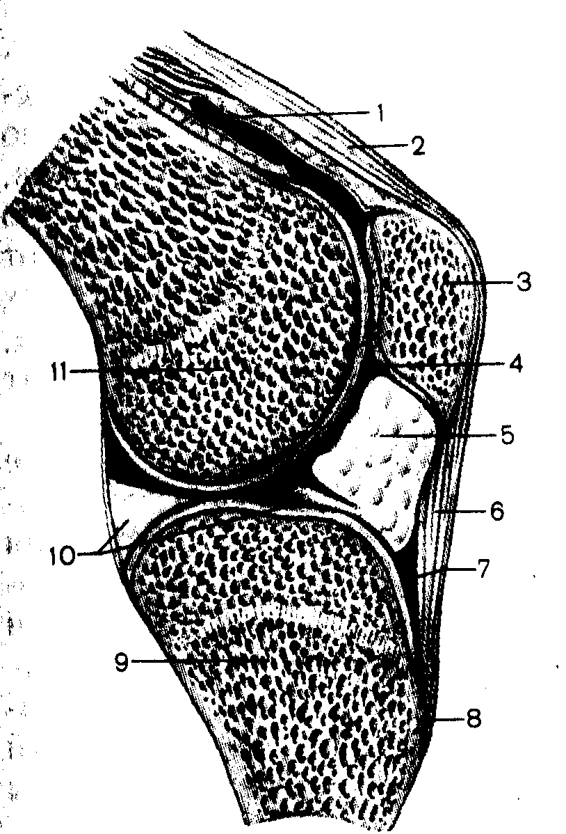 1 - lig. patellare; 2 - bursa infrapatellaris profunda; 3 - lig. transversurn genus; 4 - capsula articularis; 5 - meniscus lateralis; 6 - lig. collaterale fibulare (перерезана); 7 - lig. cruciatum posterius; 8 - meniscus medialis; 9 - lig. collaterale tibiale (перерезана); 10 - lig. cruciatum anterius.