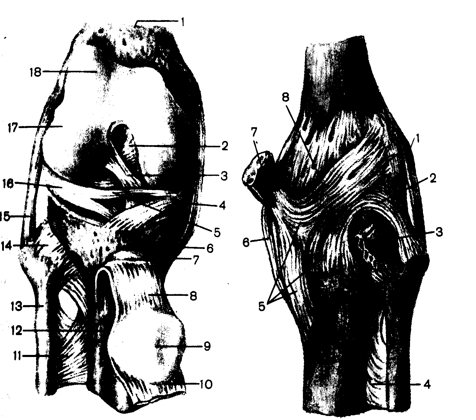 1 - os femoris; 2 - lig. cruciatum posterius: 3 - lig. cruciatum anterius; 4 - meniscus rnedialis; 5 - lig. transversum genus; 6 - lig. collaterale tibiale; 7 - bursa infrapatellaris profunda; 8 - lig. patellae; 9 - facies articularis patellae; 10 - tendo m. quadricipitis femoris; 11 - membrana interossea cruris; 12 - tibia; 13 - fibula; 14 - lig. capitis fibulae anterius; 15 - lig. collaterale fibulare; 16 - meniscus lateralis; 17 - condylus lateralis; 18 - facies patellaris.