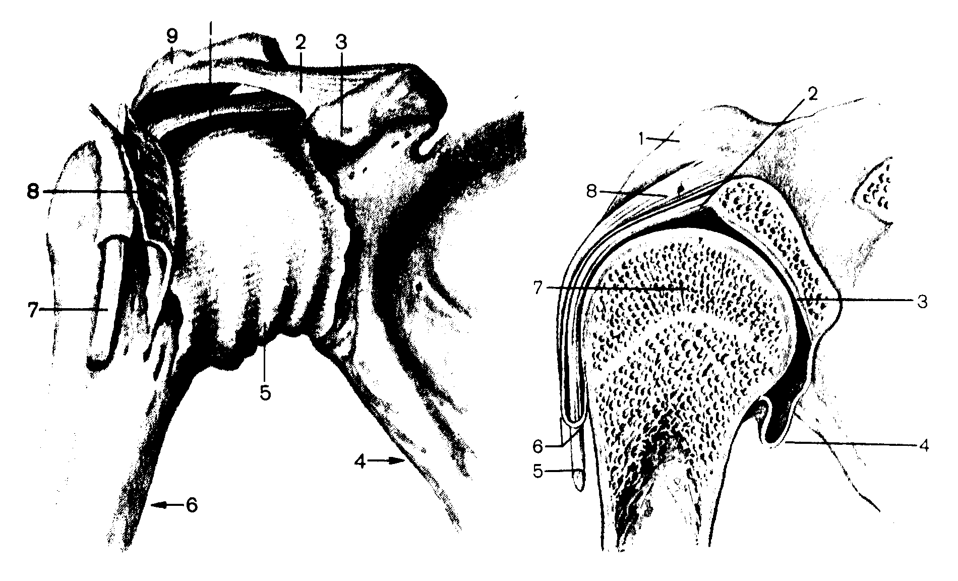 1 - lig. coracohumerale; 2 - lig. coracoacromiale; 3 - processus coracoideus; 4 - scapula; 5 - capsula articularis; 6 – humerus; 7 - tendo m. bicipitis brachii (caput longum); 8 - tendo m. sub>scapularis; 9 - acromion.