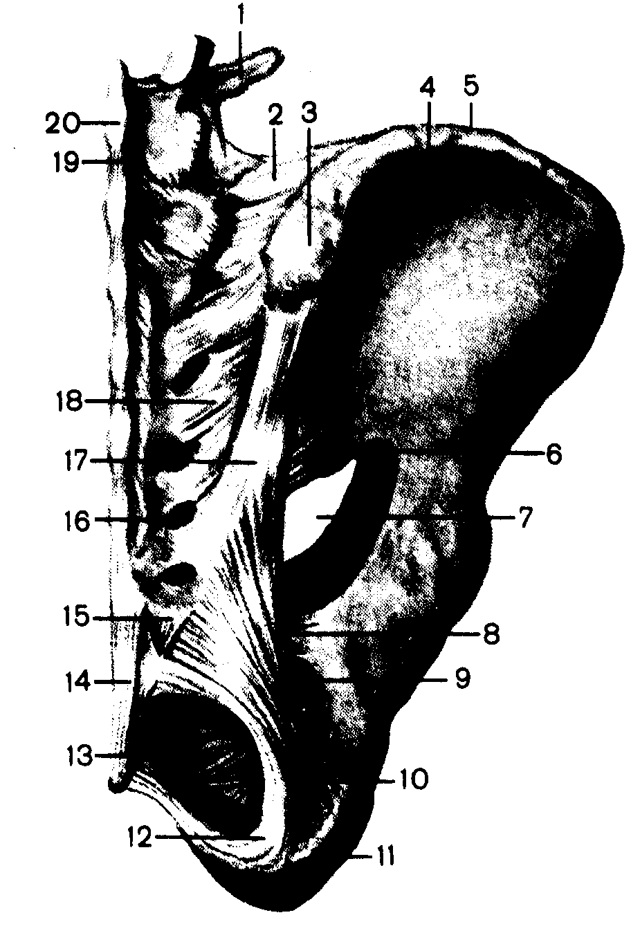 Коленный сустав подкрепляется внутрисуставными и внесуставными связками. Крестообразные связки колена являются внутрисуставными связками, они покрыты синовиальной мембраной. Передняя крестообразная связка, lig. cruciatum anterius, начинается от медиальной поверхности латерального мыщелка бедра и прикрепляется к переднему межмыщелковому полю большеберцовой кости. Задняя крестообразная связка, lig. cruciatum posterius (рис. 12), берет начало на латеральной поверхности медиального мыщелка, идет кзади и книзу и прикрепляется к заднему межмыщелковому полю большеберцовой кости. Синовиальная мембрана капсулы переходит на крестообразные связки с задней стенки полости сустава. Поэтому полость коленного сустава в заднем отделе разделена на латеральную и медиальную части, которые соединяются между собой только спереди. Спереди и снизу границей между правой и левой частями полости коленного сустава является поднадколенниковая синовиальная складка.