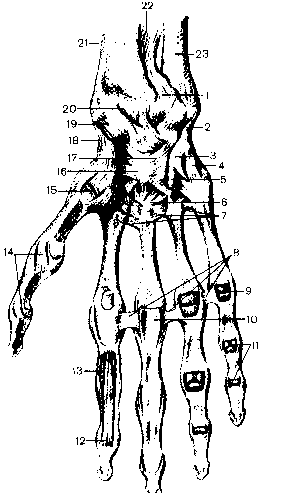 1 - art. radioulnaris distalis; 2 - lig. collaterale carpi ulnare; 3 - lig. pisohamatum; 4 - lig. pisometacarpale; 5 - hamulus ossis hamati; 6 - ligg. carpometacarpalia palmaria; 7—ligg. metacarpalia palmaria; 8 - ligg. metacarpalia transversa profunda; 9 - art. metacarpophalangealis (вскрыт); 10 - vagina fibrosa digitorum manus (вскрыта); 11 - art. interphalangeales (вскрыты); 12 - tendo m. flexoris digitorum profundi; 13 - tendo m. flexoris digitorum superficialis; 14 - ligg. collateralia; 15 - art. carpometacarpalis pollicis; 16 - os capitatum; 17 - lig. carpi radiatum; 18 - lig. collaterale carpi radiale; 19 - lig. radiocarpale palmare; 20 - os lunatum; 21 - radius; 22 - membrana interossea antebrachii; 23 — ulna.