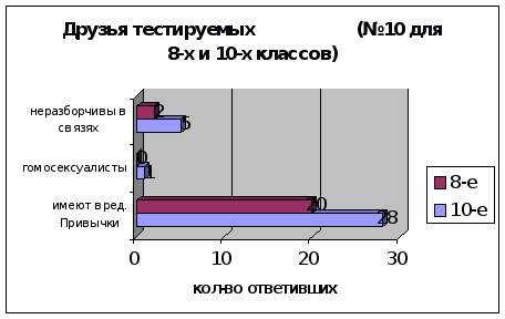 Диаграммы 8 и 9 нам показывают, что 10-классники имеют гораздо больше друзей, имеющих вредные привычки, по сравнению с 8-классниками, в то время как лиц с вредными привычками наоборот, больше в восьмых классах. Отсюда можно сделать вывод, что ученики 8-х классов более подвержены вредному влиянию, в то время как 10-классники уже поменяли свой круг интересов, что подтверждают две пары верхних столбиков в диаграммах 8 и 9.