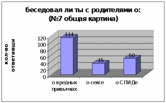 Тестирование проводилось в свободное от уроков время( после них и во время классных часов). Перед тестированием учащимся была объяснена цель, кроме того мы не проводили просветительские работы, что помогло нам выявить реальную картину информированности, однако, как показал блок 3, лекции на эту тему проводились во многих классах до тестирования. Тестируемые отнеслись к работе достаточно серьёзно во всех возрастных группах. Смех вызывали только самые абсурдные вопросы, например: «являются ли группой риска лица отслужившие в армии?»(5-з). Учителя, присутствующие на тестировании(классные руководители и др.), тоже отнеслись с пониманием, помогали установить дисциплину, а иногда и поясняли тестируемым некоторые непонятные слова. И лишь один учитель отказал нам в просьбе провести тестирование в его классе.
