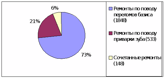Рис. 2. Соотношение различных видов ремонтов съемных пластиночных протезов.
