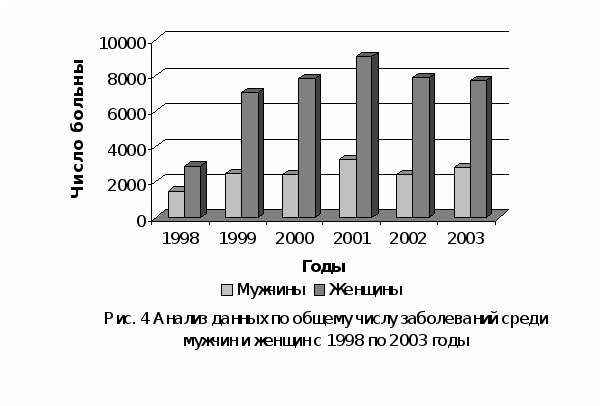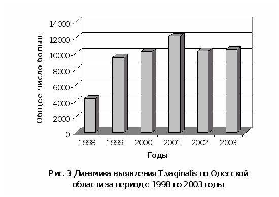 Таким образом, за 1998 год возбудитель впервые выявлен у 4338 человек, среди них: мужчины – 1462, женщины – 2867. За 1999 год, заболело 9543 человек, из которых: мужчин – 2479, женщин – 7064. В 2000 году общее число больных оставило 10242 человек. Среди них: мужчин – 2411, женщин – 7831. Общее количество больных в 2001 году составило 12265: мужчин – 3243, женщин – 9022. За период 2002 года всего заболело 10329 человек, где мужчины составили 2448, женщины – 7881. 2003 год дал общее число больных 10541, из которых мужчины составили 2833, а женщины – 7708.